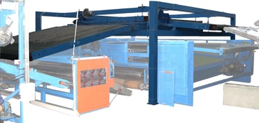 From this crossbar, the web falls onto a lower belt positioned at 90° to the feed belt. This belt feeds the web into the STRATO (Vertical Lapper) head.