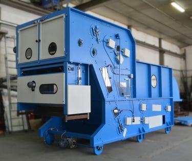 This operation is made possible by a special opening unit located on the loading side of the vertical spike conveyor. The 1053-2T model with 2 feed belts is suitable for this purpose.