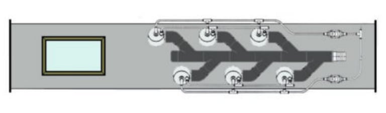 The oiling tube mod. 1075-T allows the application of emulsified oil directly into the fibre transport pipe. It consists of a stainless steel tube on which two rows of nozzles (3+3) are mounted, controlled by independent solenoid valves.