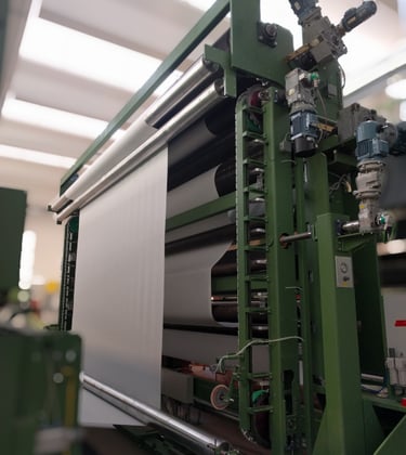 Cette machine est utilisée dans l'industrie des tissus non tissés, en particulier dans le secteur des géotextiles.