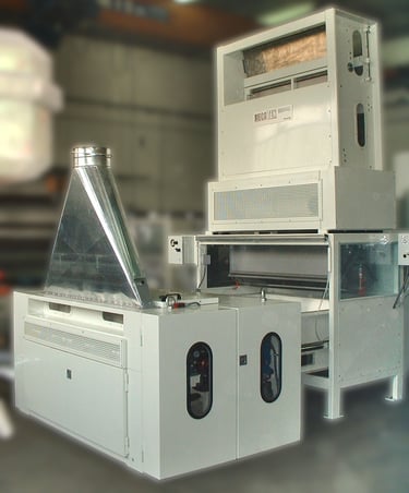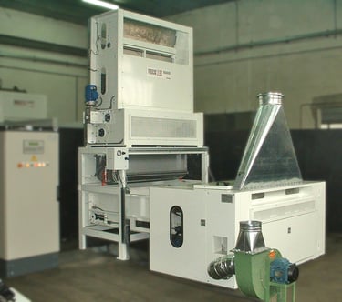 Machine adaptée à la transformation des fibres (naturelles ou synthétiques) en petites boules utilisées pour le rembourrage d'oreillers et de coussins.