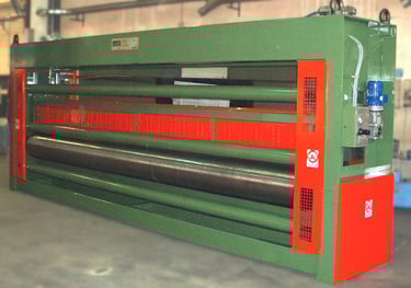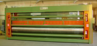Le matériau à gaufrer est entraîné au-dessus des deux contre-cylindres tandis que le cylindre de gaufrage tourne au-dessus et imprime le motif aux points de contact.